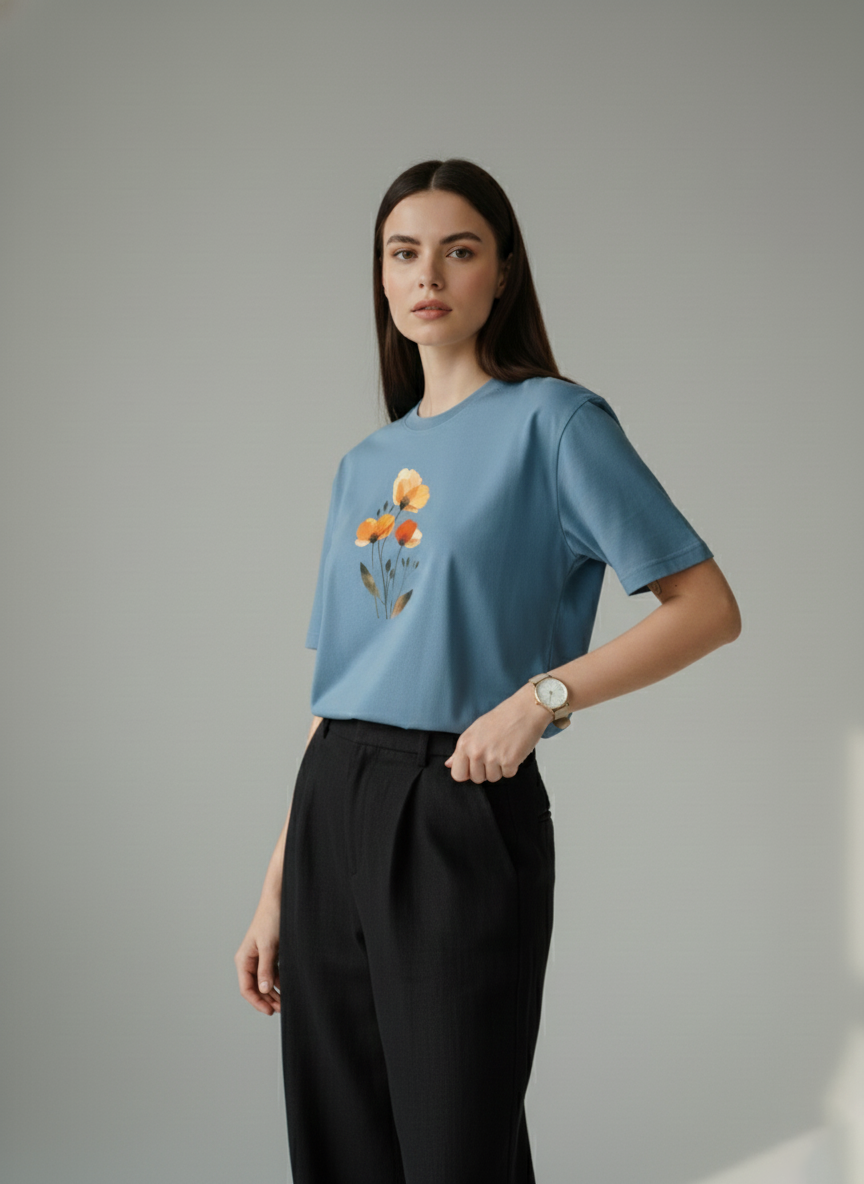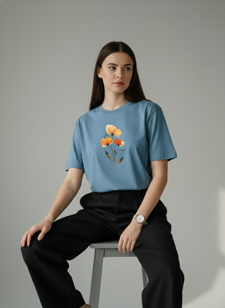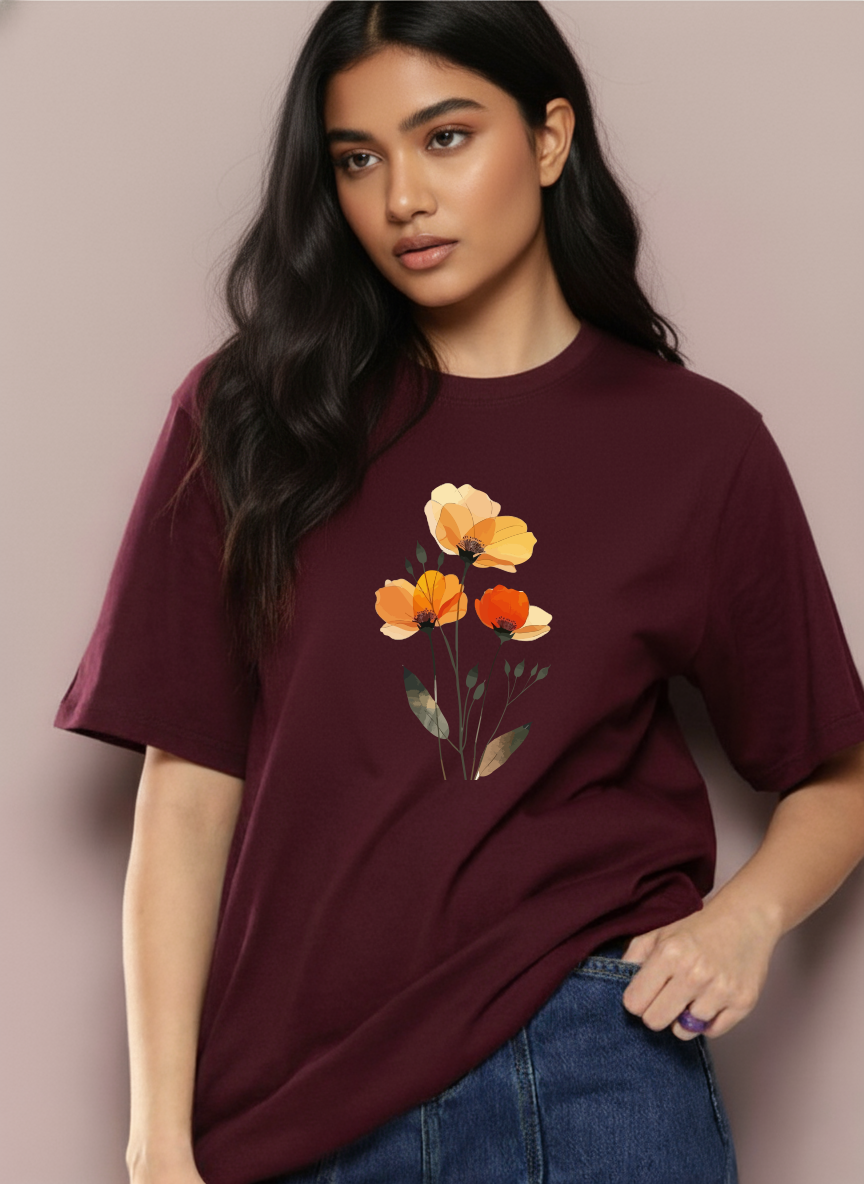 This T-shirt features a beautifully layered illustration of blooming flowers in warm orange and yellow tones, giving it a soft, artistic appeal. Crafted from comfortable, breathable fabric, it offers a relaxed fit that’s perfect for casual outings, everyday wear, or creating a stylish yet minimal look. Delicate, modern, and versatile—this tee adds a graceful floral touch to any wardrobe.
