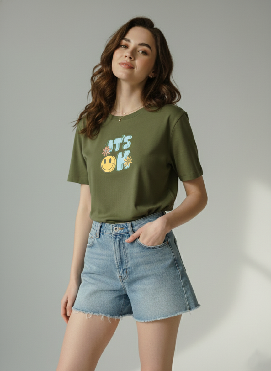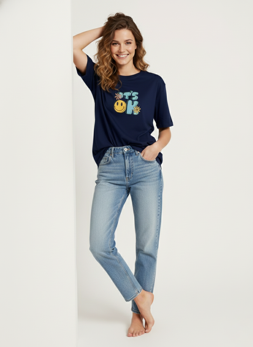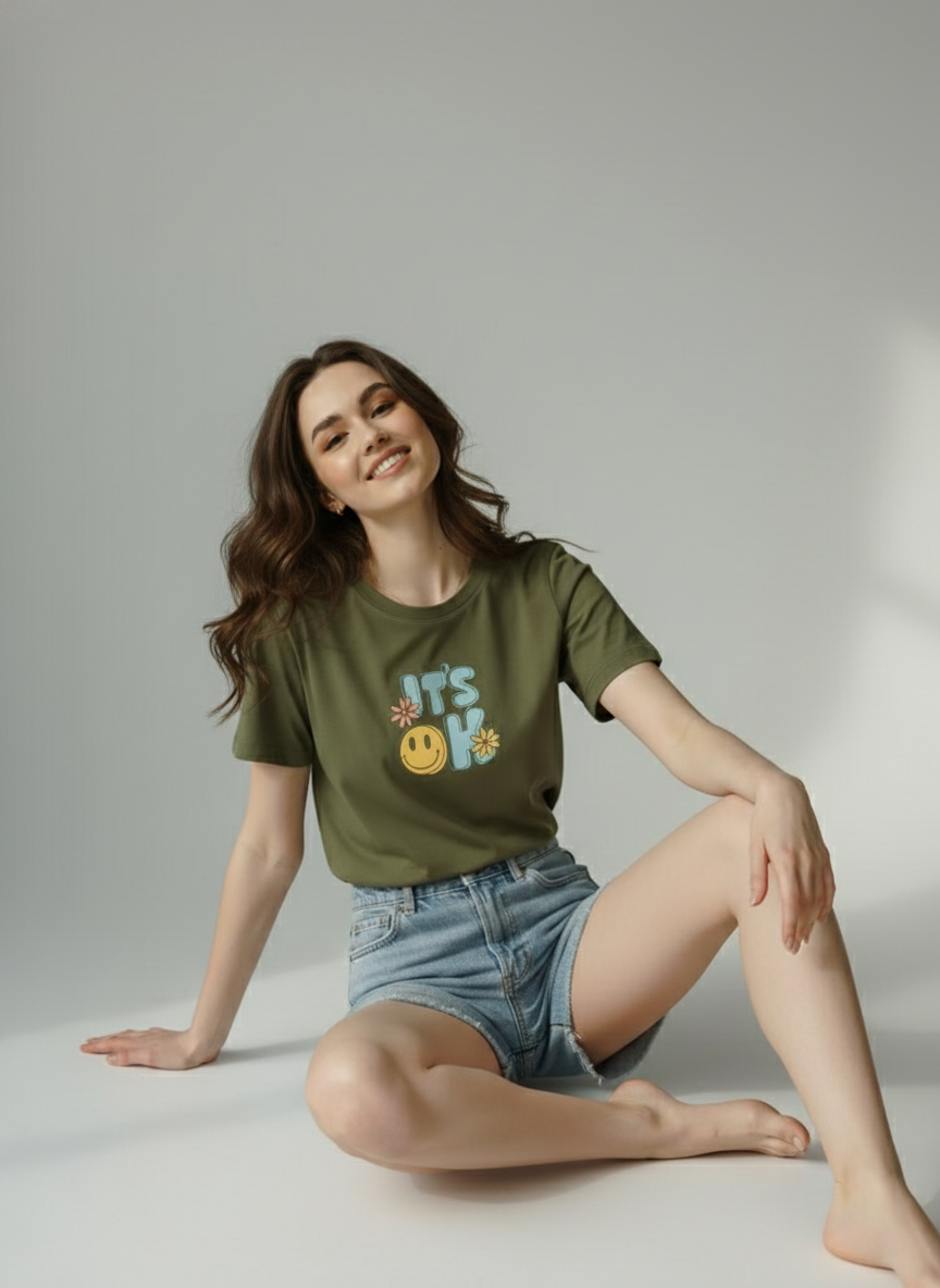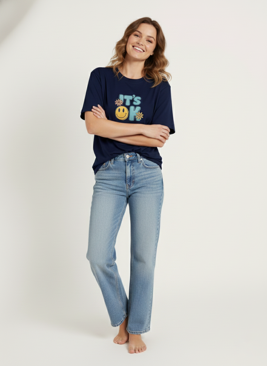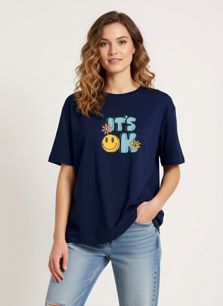 This navy blue T-shirt features a fun retro-style design with bold, bubbly lettering that reads “It’s OK” , accented with playful flowers and a bright yellow smiley face. Made from soft, breathable fabric, it offers a relaxed fit perfect for everyday comfort, casual outings, or mood-boosting style. A feel-good tee that spreads good vibes effortlessly. The model (height 5'6) is wearing a size M Material & Care: Single Jersey 100% Premium Cotton, Bio washed Machine Wash as per tag