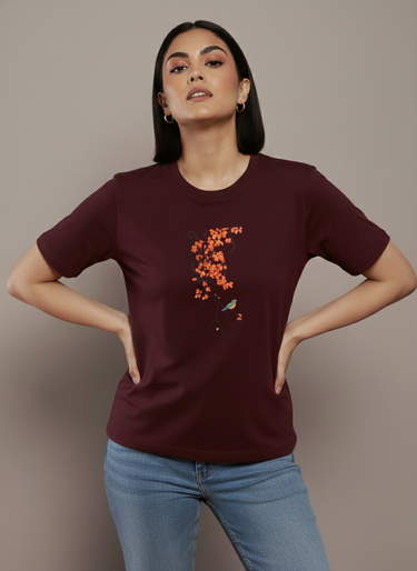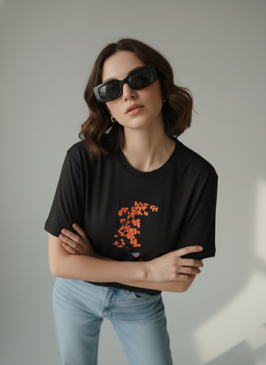 This classic T-shirt features a beautifully minimalist design of bright orange leaves cascading from a branch, accented with a small, colorful bird perched delicately below. Crafted from soft, breathable fabric, it offers a relaxed and comfortable fit—perfect for casual outings, travel days, or effortless everyday style. Artistic, subtle, and eye-catching, this tee brings a touch of nature’s charm to your wardrobe.