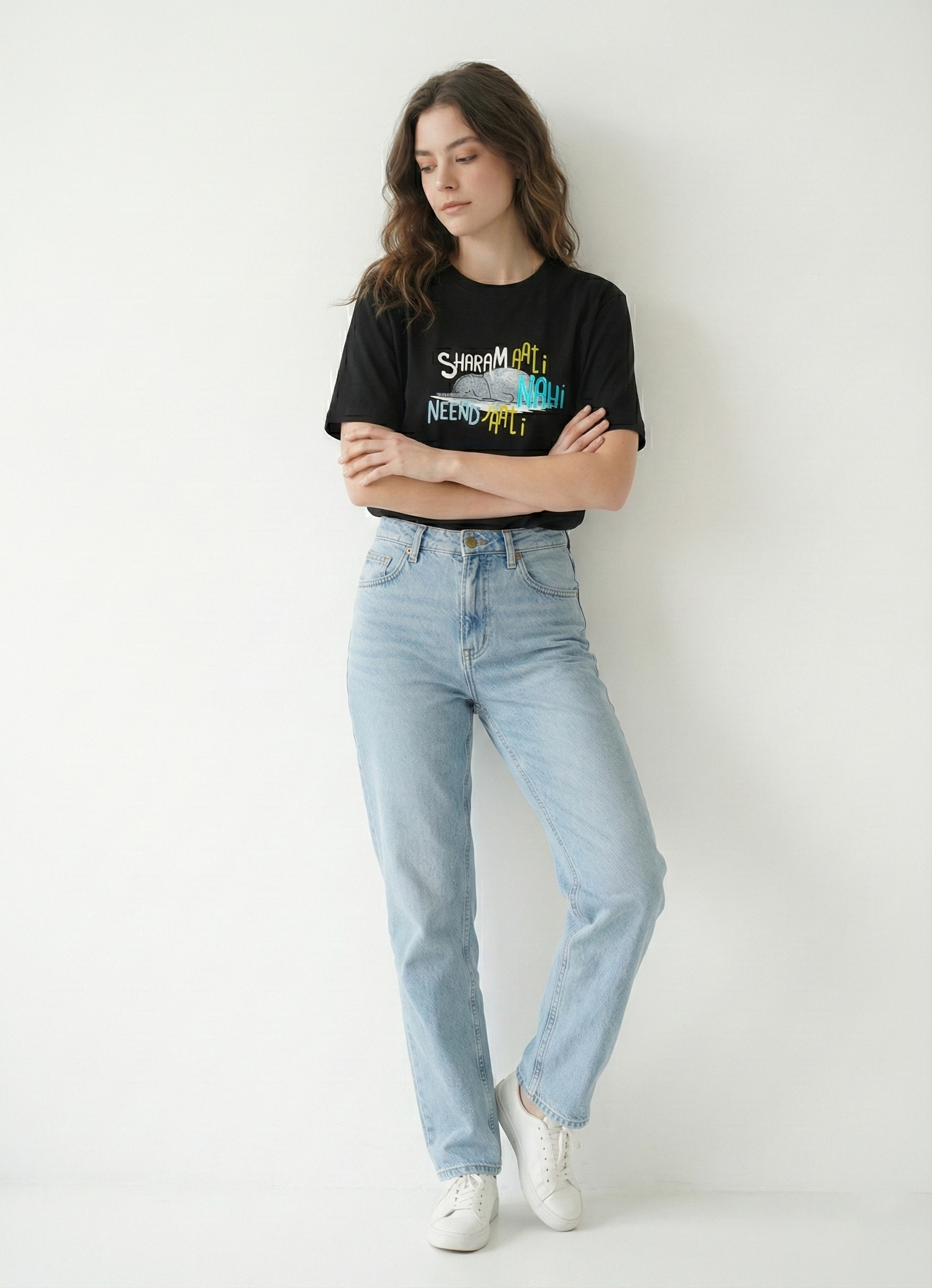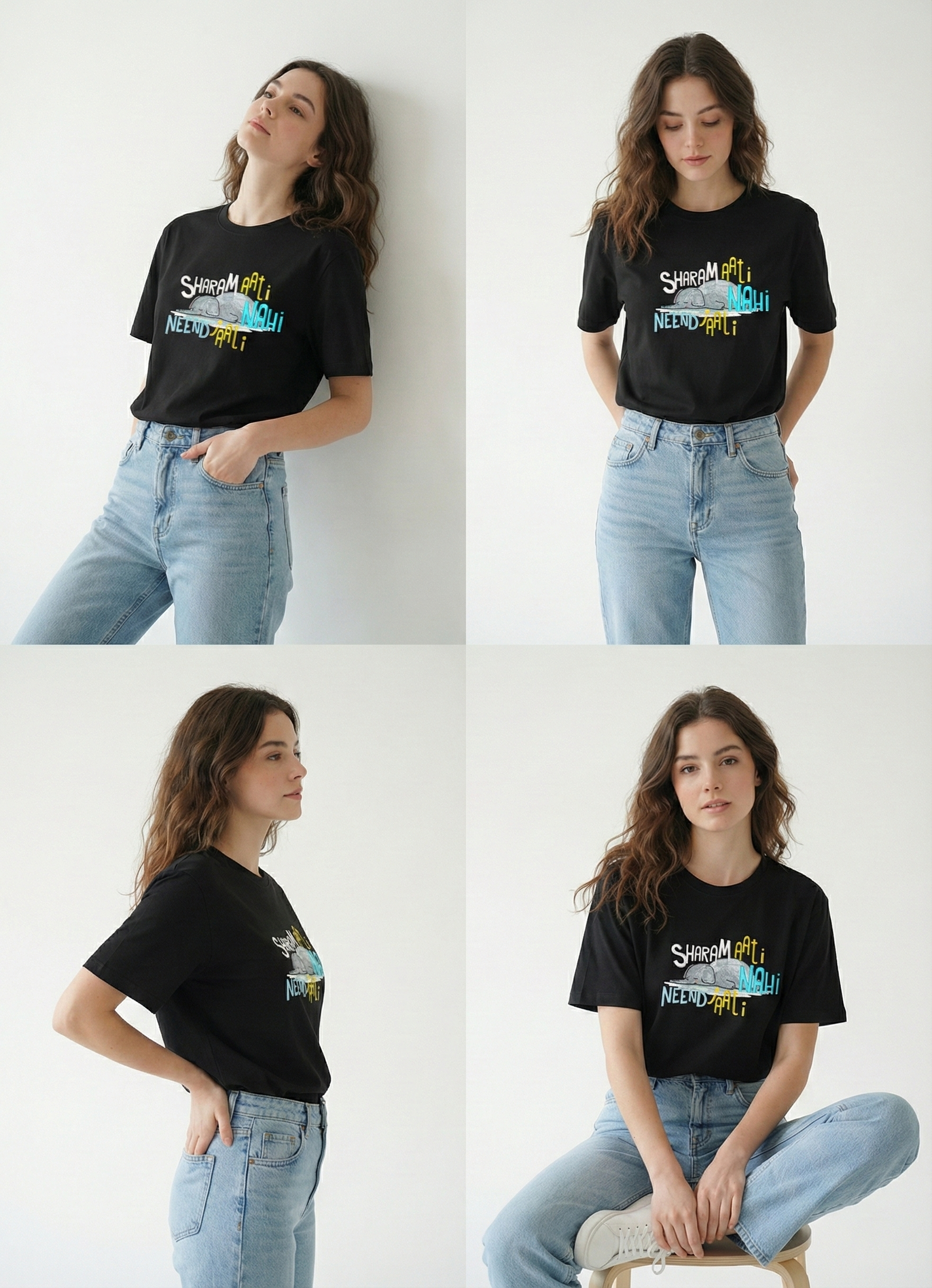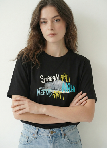 This black tee features a striking “lazy elephant” graphic with a detailed typography "Sharam aati nahi, Neend Jaati nahi"—perfect for those who love to be Lazy and Relaxed. The model (height 5'6) is wearing a size M Material & Care: Single Jersey 100% Premium Cotton, Bio washed Machine Wash as per tag