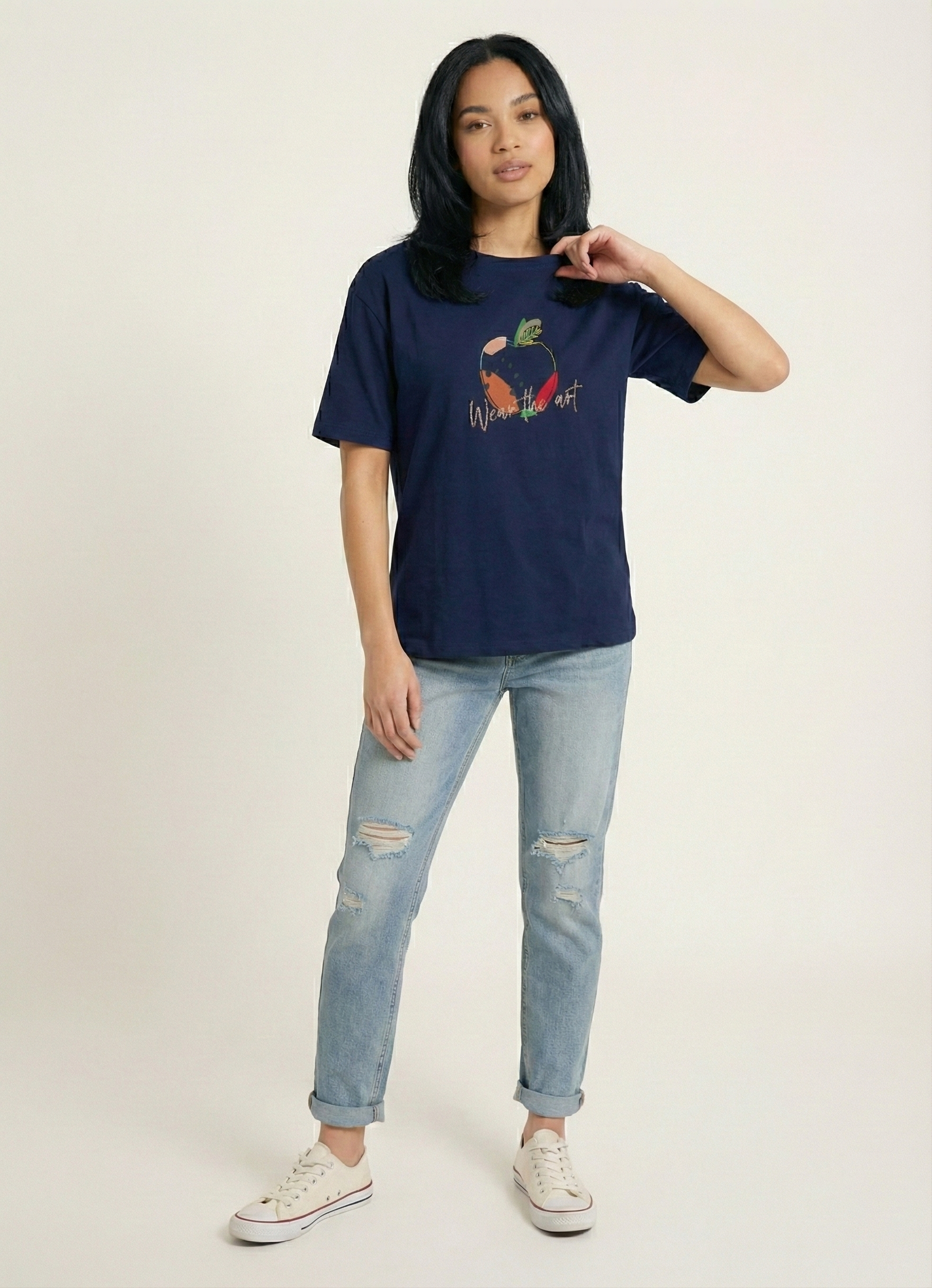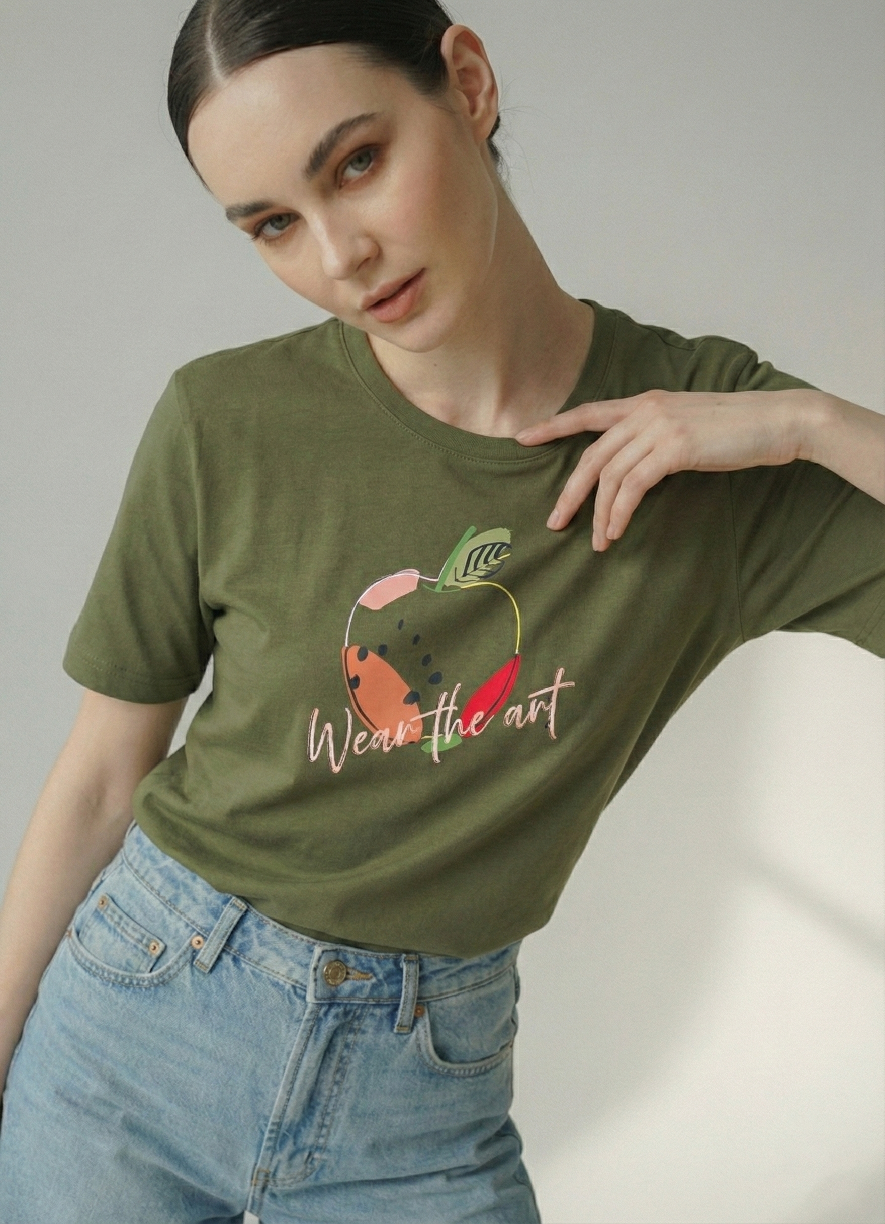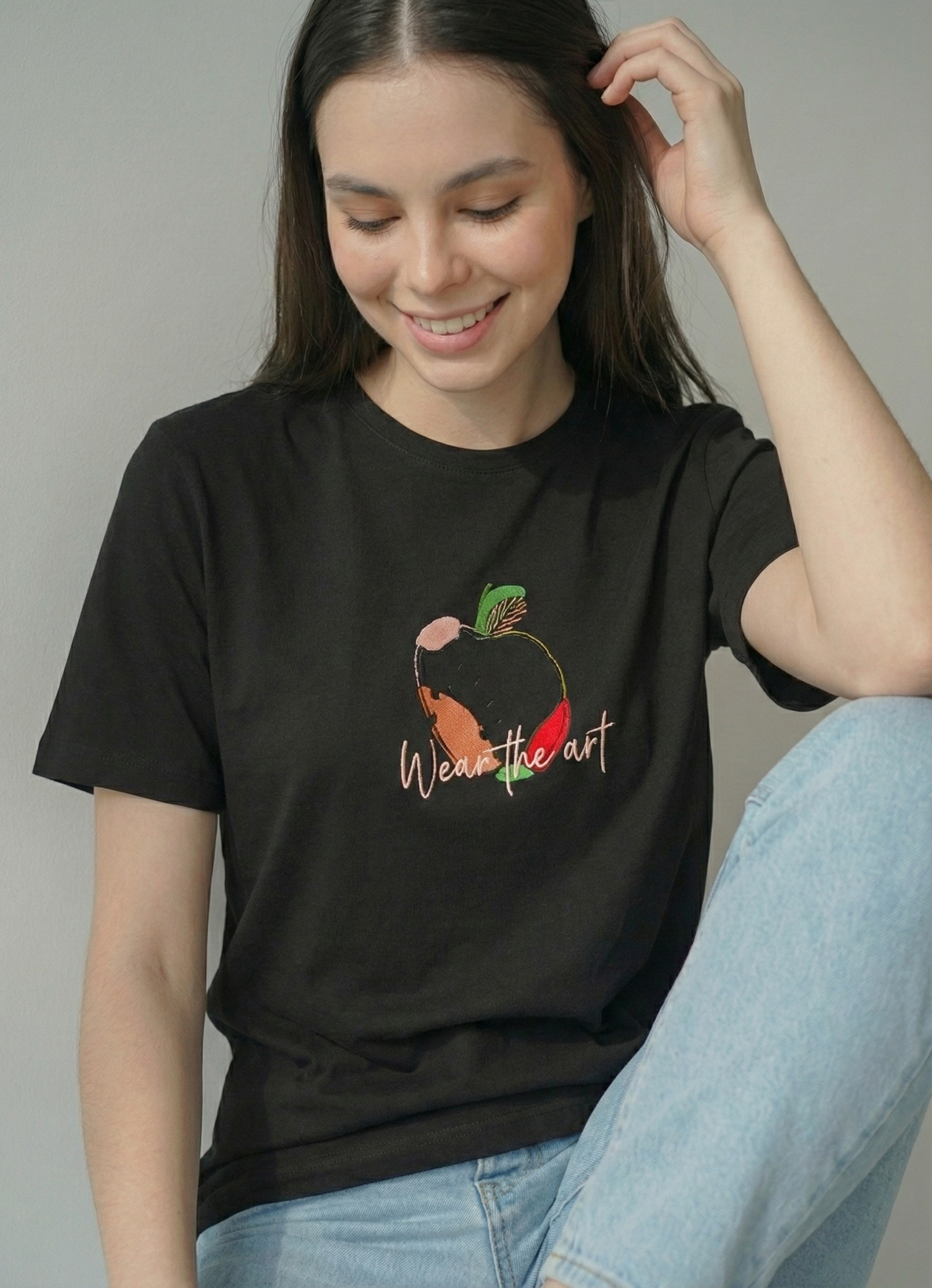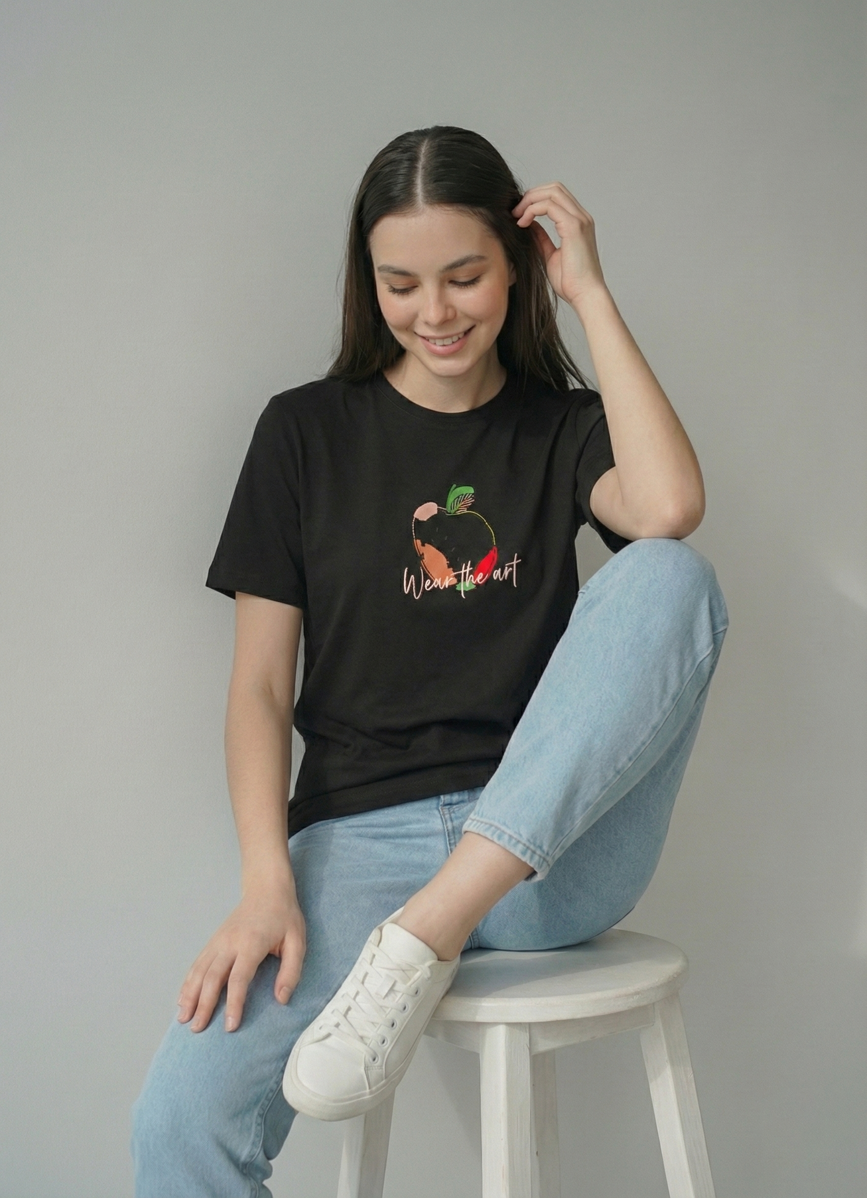 Crafted from soft,  breathable cotton, This t-shirt features a vibrant abstract apple design with the phrase “Wear the art”. Made from soft premium cotton, breathable material for all-day comfort — ideal for casual outings and artistic minds.