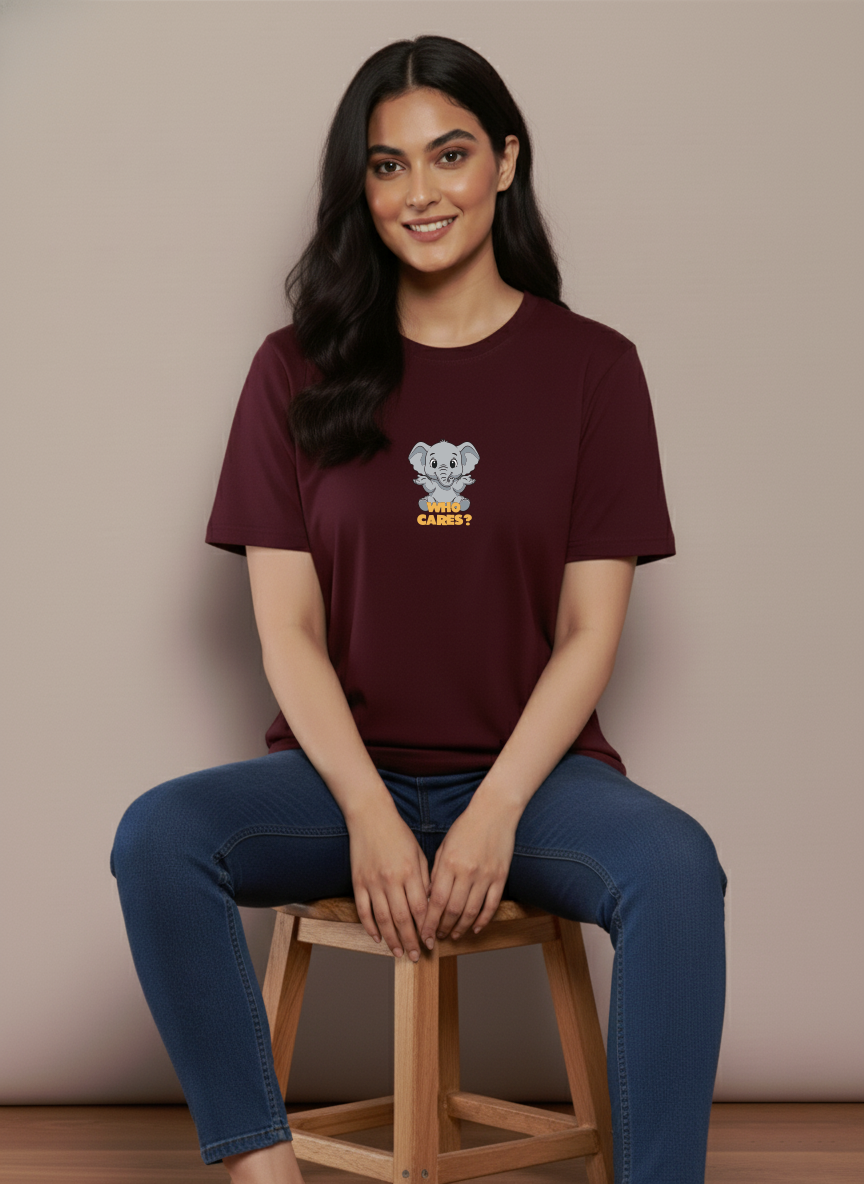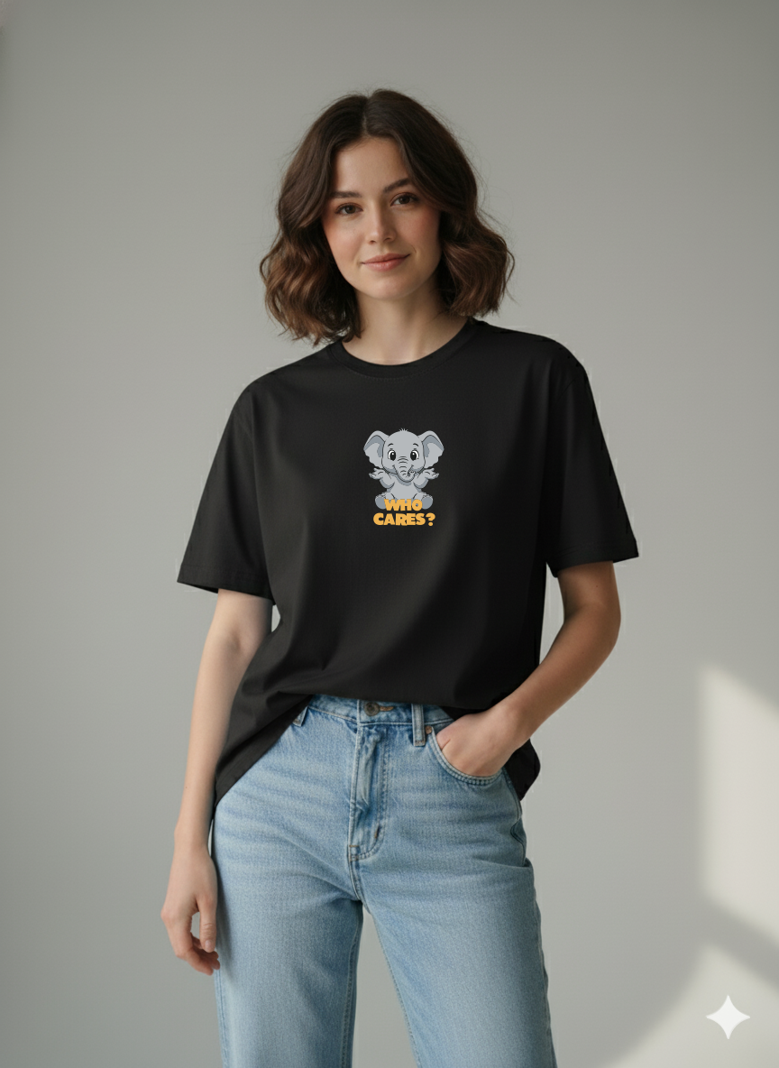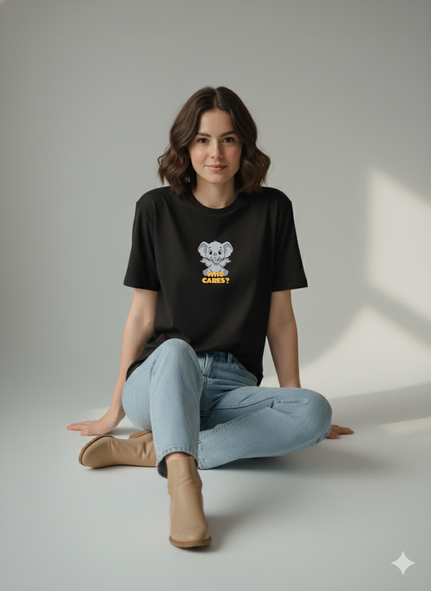 A comfy tee featuring a cute elephant graphic and the playful phrase “Who Cares?”. Soft Cotton fabric, relaxed fit, and perfect for effortless everyday style.