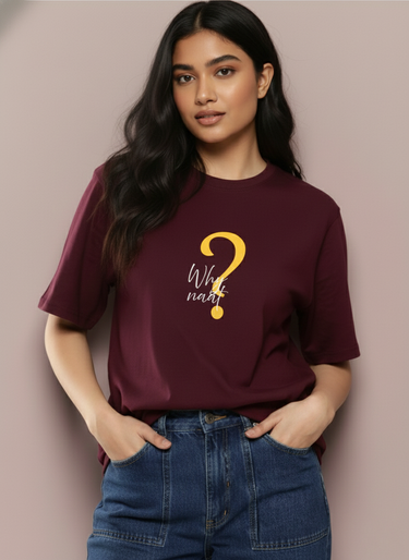 Crafted from soft,   breathable cotton, this tee features a bold mustard question-mark graphic   paired with the playful phrase “Why not?” in elegant script. The relaxed   boyfriend fit, half sleeves, and smooth finish make it perfect for effortless   styling — whether paired with denim for a casual day out or layered for a   trend-forward look. A blend of comfort and attitude, this T-shirt is designed   for those who love to keep it simple yet expressive.