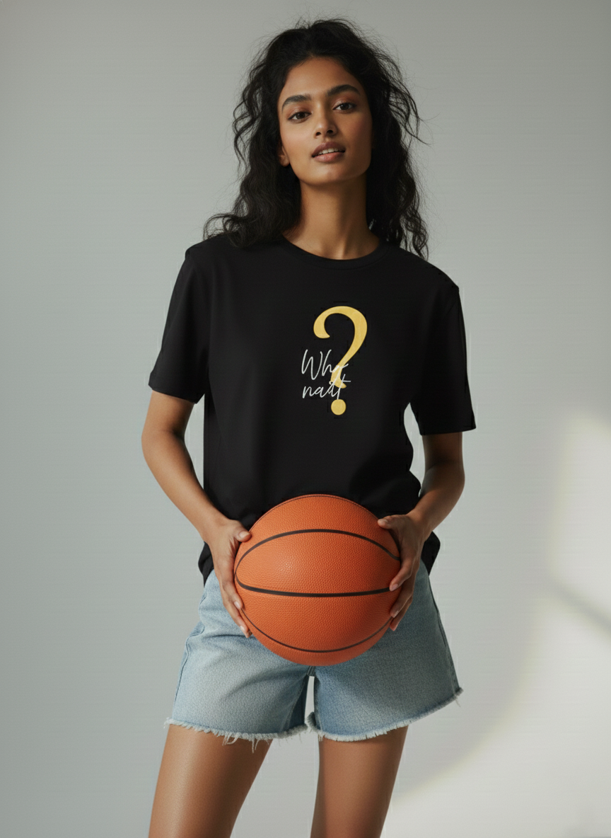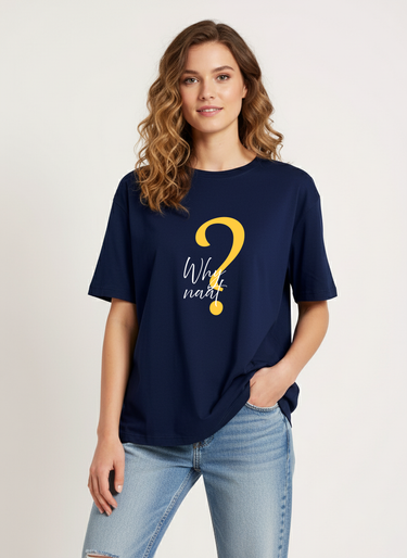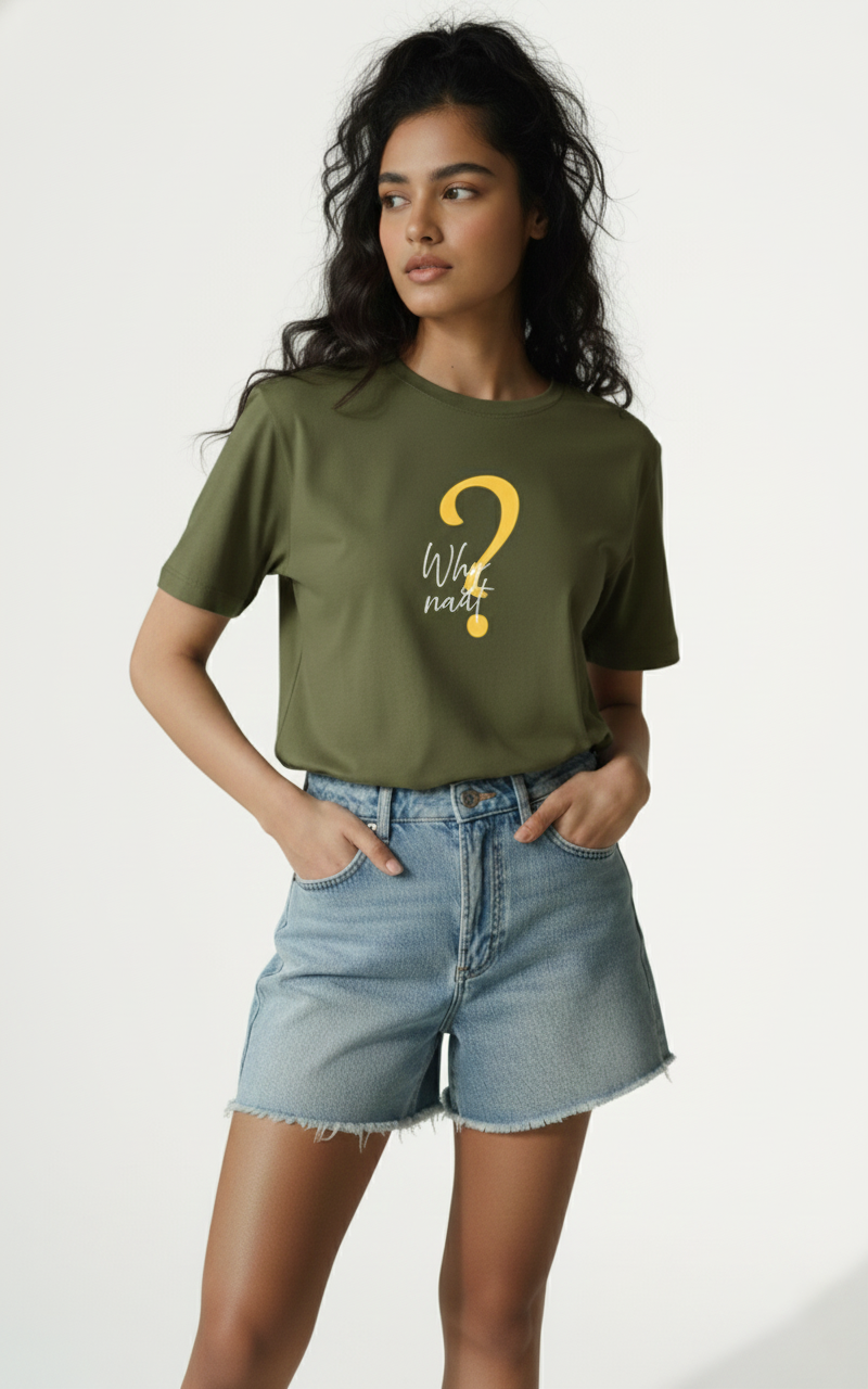 Crafted from soft,   breathable cotton, this tee features a bold mustard question-mark graphic   paired with the playful phrase “Why not?” in elegant script. The relaxed   boyfriend fit, half sleeves, and smooth finish make it perfect for effortless   styling — whether paired with denim for a casual day out or layered for a   trend-forward look. A blend of comfort and attitude, this T-shirt is designed   for those who love to keep it simple yet expressive.