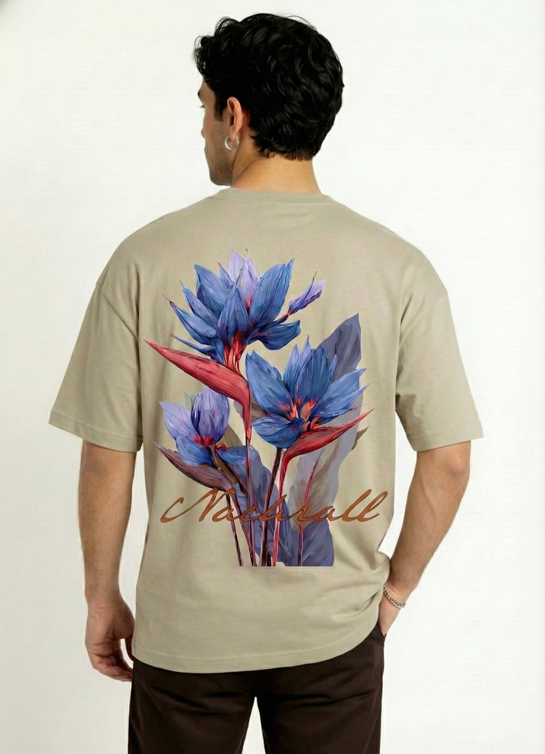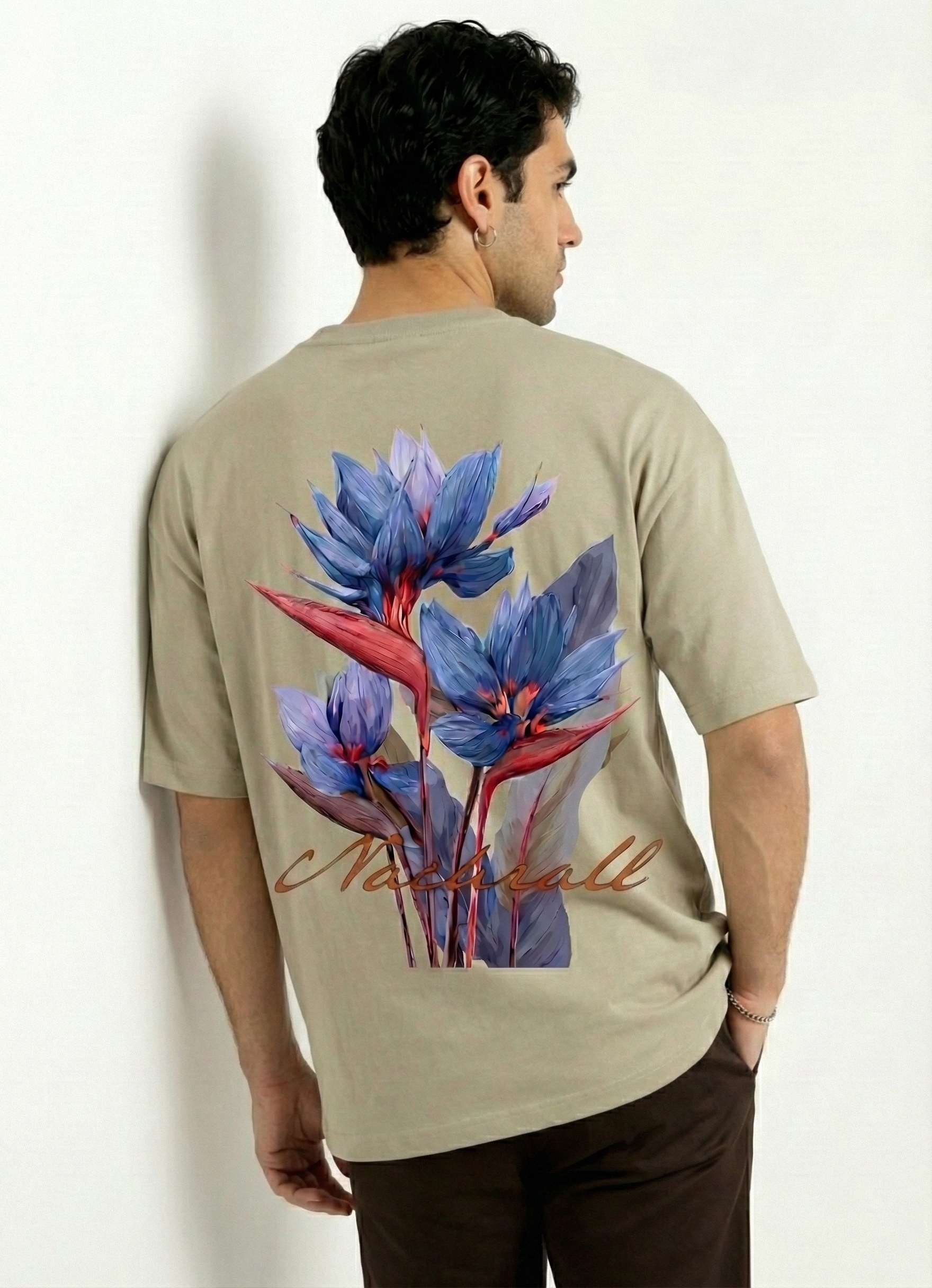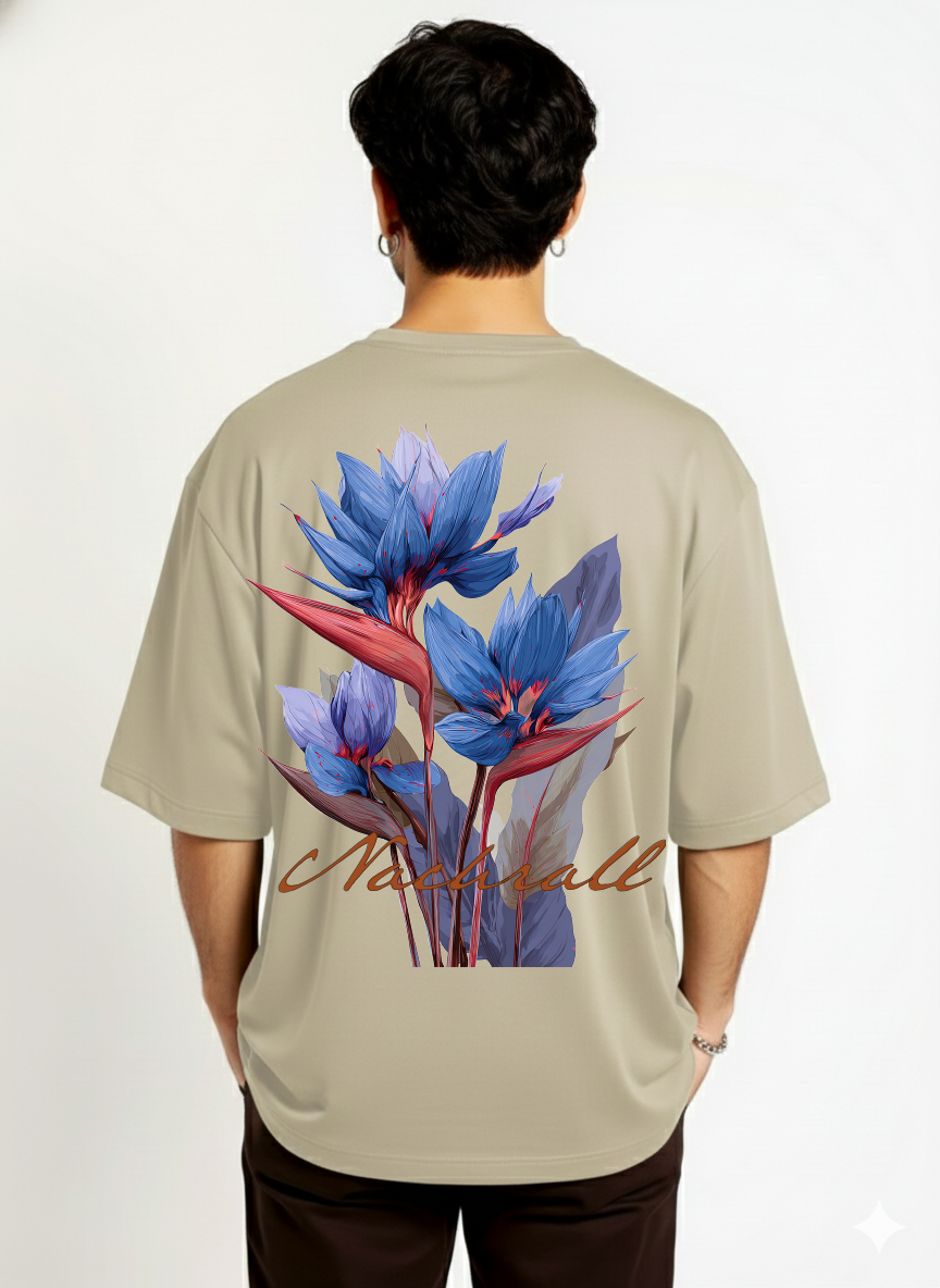 Designed for those who appreciate art in motion, this t-shirt combines modern streetwear silhouettes with distinct botanical aesthetics. The piece features a neutral sand/beige canvas that perfectly highlights the vibrant, large-scale graphic on the back.